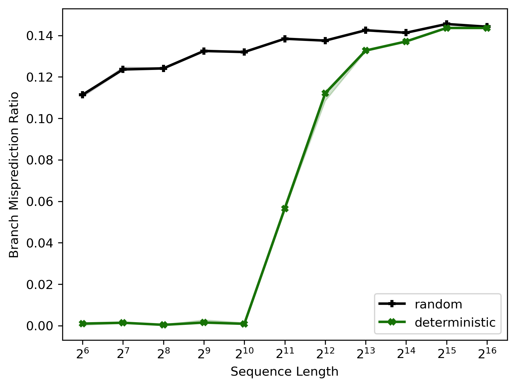 It seemed like the drop was too much to be simply due to different memory access patterns. Since the data is random, the branching pattern is random. I’ve no clue how the branch predictor in my laptop works; but what if it really can memorize roughly a thousand random choices?
